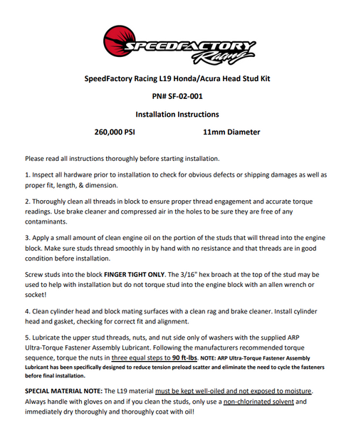 SpeedFactory Racing Extreme Duty L19 Head Stud Kit for Honda/Acura B & K SeriesSpeedFactory Racing
